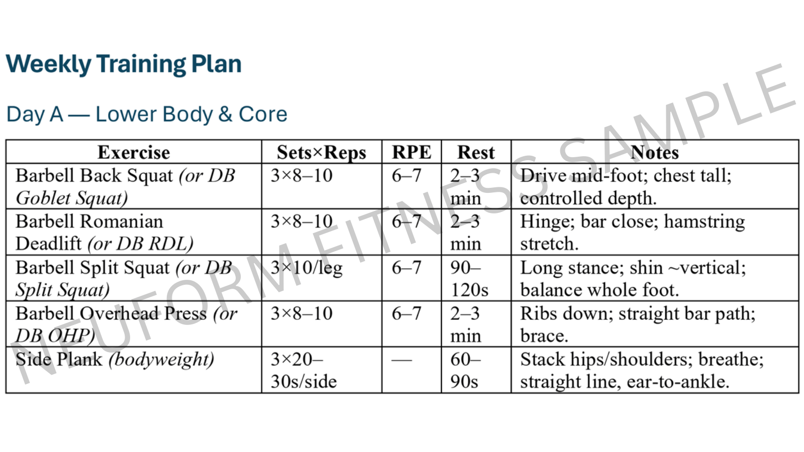 6-Week Beginner Foundation Training Plan Master the basics, build confidence, and create a foundation for long-term progress. 3-Day Split Strength + Hypertrophy Beginner 3 structured sessions per week to build confidence. Simple linear progression with RPE guardrails. Skill-first design to master fundamentals. Built-in Week-6 deload for recovery and growth. WAITLIST $25 $49 Buy Now → Complete Your Training Warm-Up & Stretch Pack (50% off) Buy Now → I agree to the Terms and acknowledge digital downloads are final sale. Instant digital download. Start strong with proven fundamentals.