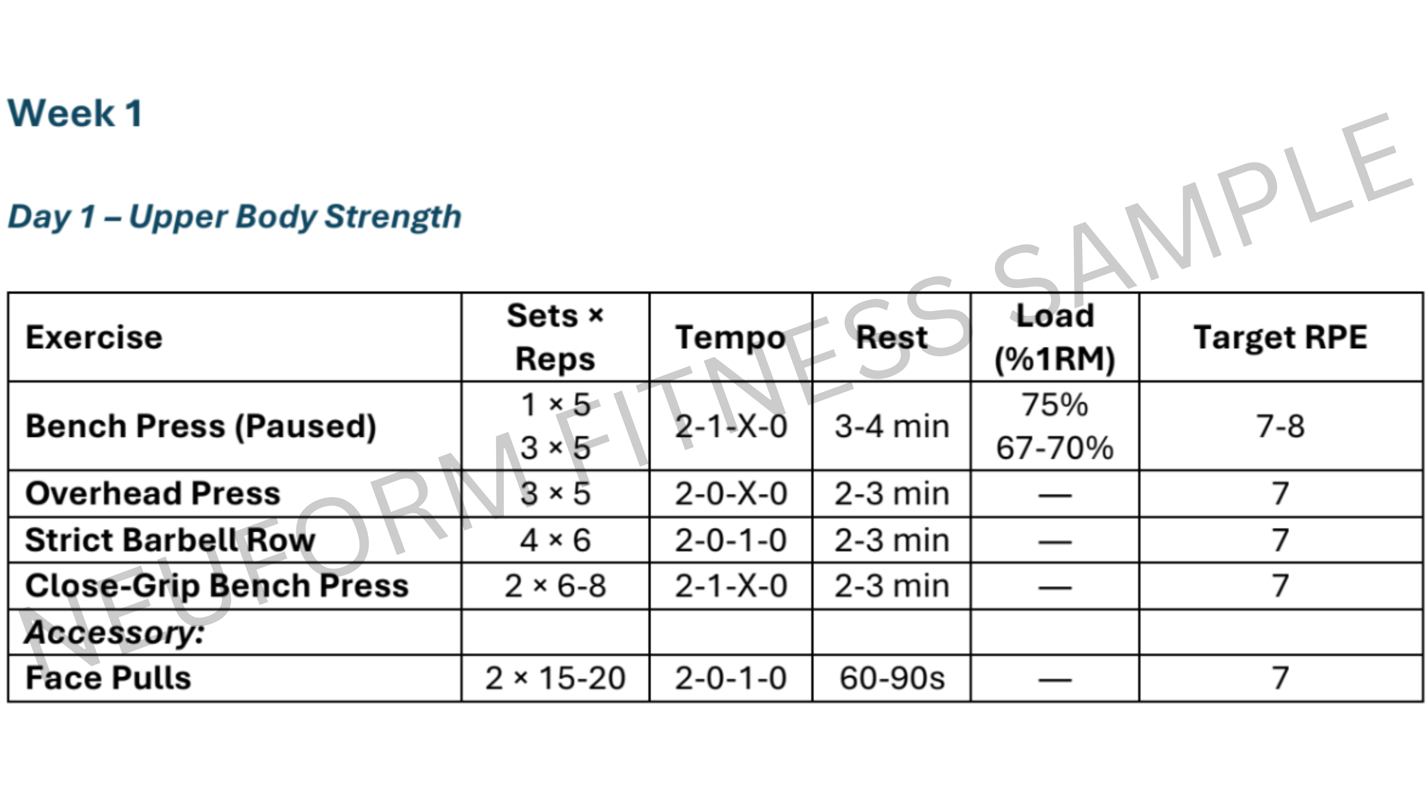 6-Week Strength Training Plan Build maximal strength with structured overload and integrated 1RM testing. 4-Day Split Strength Intermediate Structured 1RM tests: Deadlift (Week 4), Squat (Week 5), and Bench Press (Week 6). Progressive percentage blocks with RPE-based accessories. Clear ramping protocols for max attempt readiness. 4-day Upper / Lower A-B rotation for recovery. WAITLIST $30 $59 Buy Now → Complete Your Training Warm-Up & Stretch Pack (50% off) Buy Now → I agree to the Terms and acknowledge digital downloads are final sale. Instant digital download. Structured for peak strength and testing.
