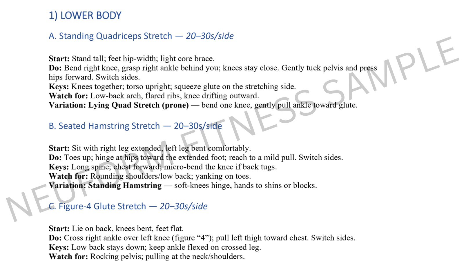 Full-Body Static Stretching Routine Improve mobility, recovery, and flexibility with targeted full-body stretches. -Day Split Recovery All Levels Guided post-workout cooldown for lasting flexibility. Reduces tightness and supports joint mobility. Complements training blocks for faster recovery. WAITLIST $10 $15 Buy Now → Buy Now → I agree to the Terms and acknowledge digital downloads are final sale. Instant digital access. Recover better and move without restriction.